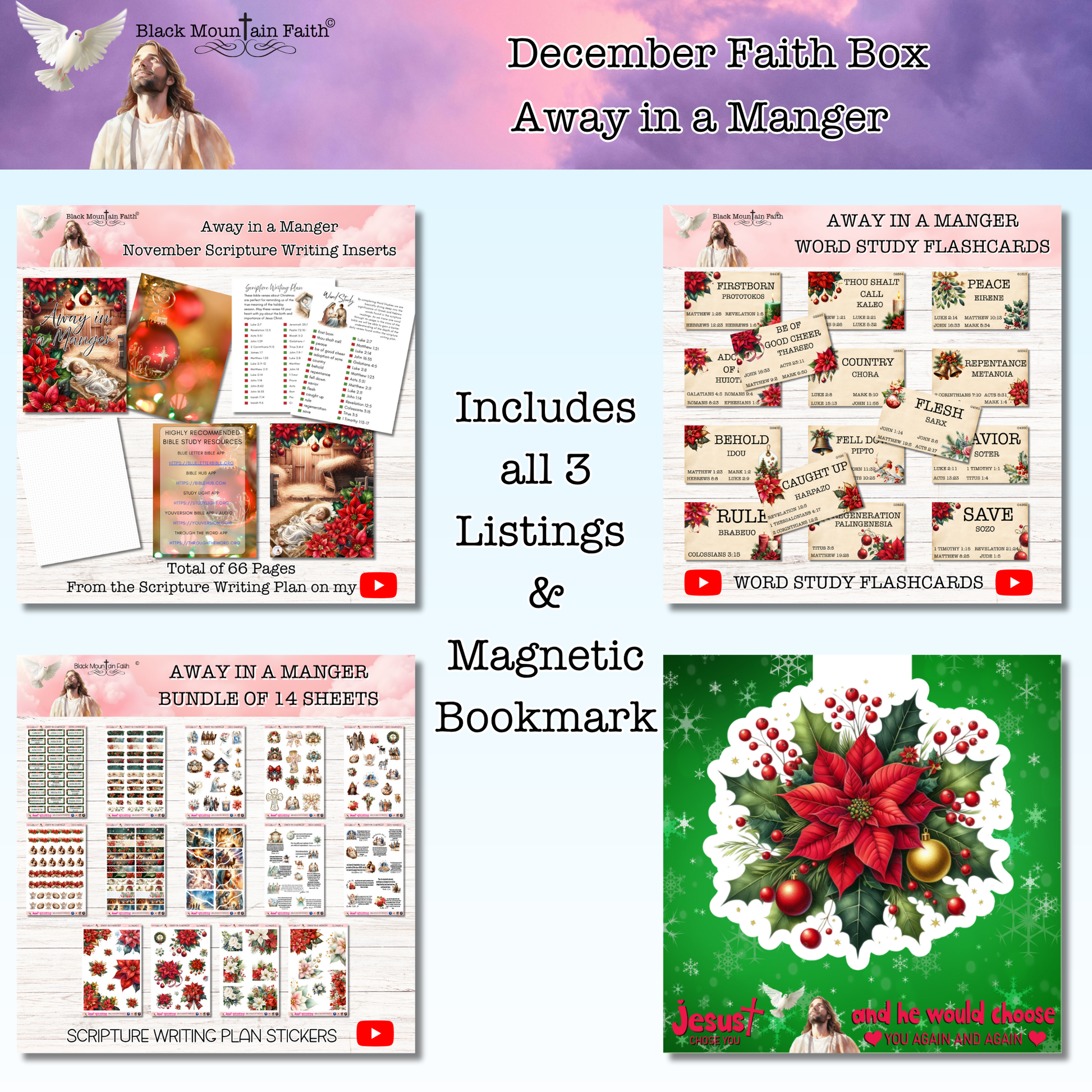 This listing is for the December Faith Box. It includes the inserts, word study flash cards, 14 sheet sticker bundle and a magnetic bookmark. This box has a set price no matter what insert size you select. Please choose you insert size and punch options in the drop down menu below.