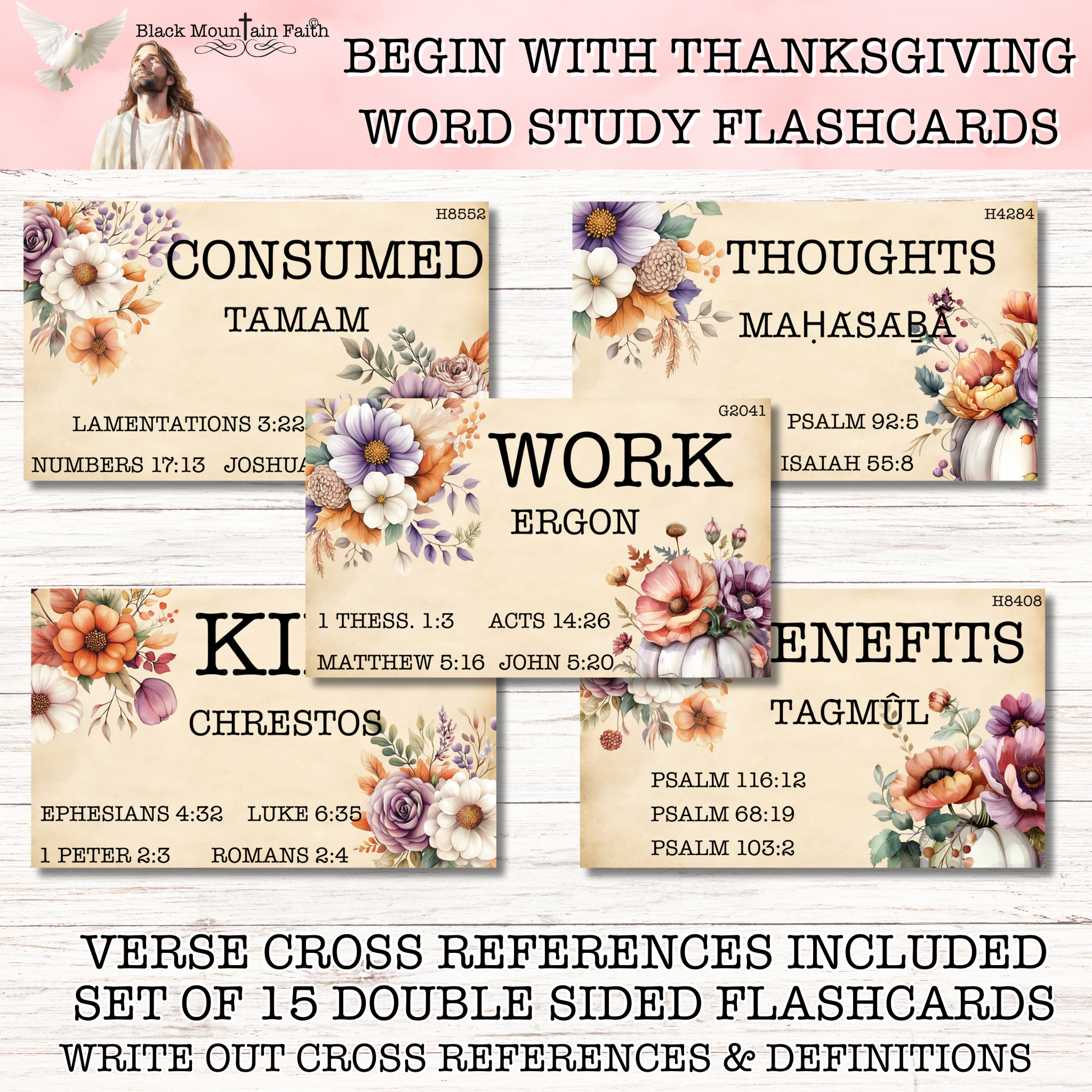 This listing comes with 15 borderless card stock flashcards (110 GSM). Each card corresponds to the monthly scripture writing plan. Every flashcard has the Strong's number, cross reference verses, the word study word, and the transliteration of that word. The reverse side of the card has a borderless vintage distressed paper pattern that you can write out the definition, cross reference verses, decorate and/or write notes. All flashcards are sized 3 x 5 inches (index card size). Word Study Flashcards encourage you to get more out daily scripture reading and add a fun creative touch when studying the bible.