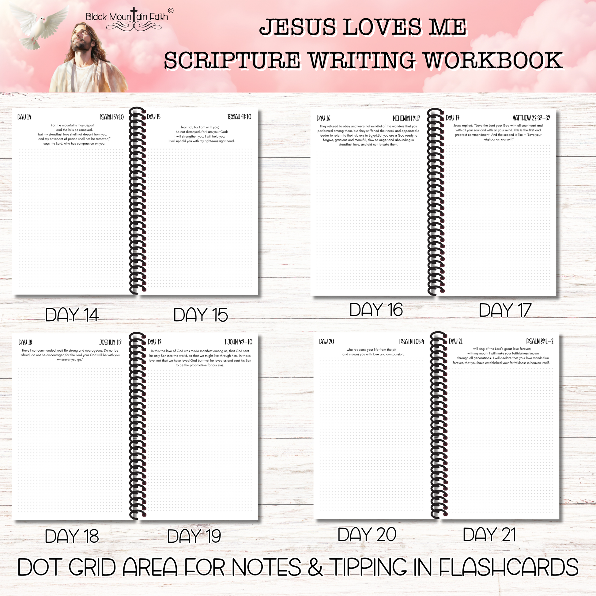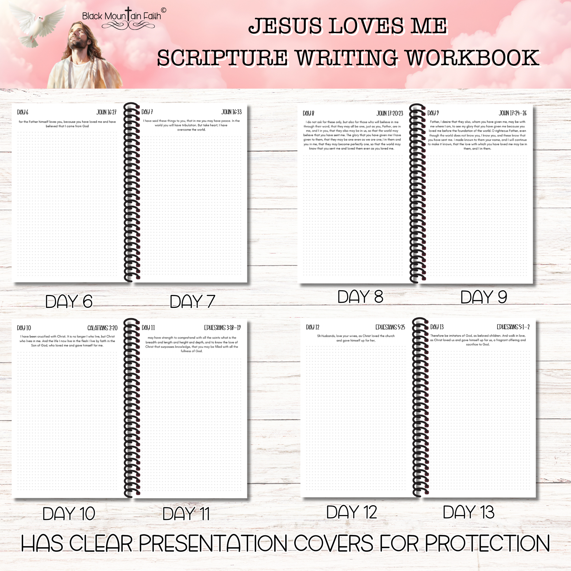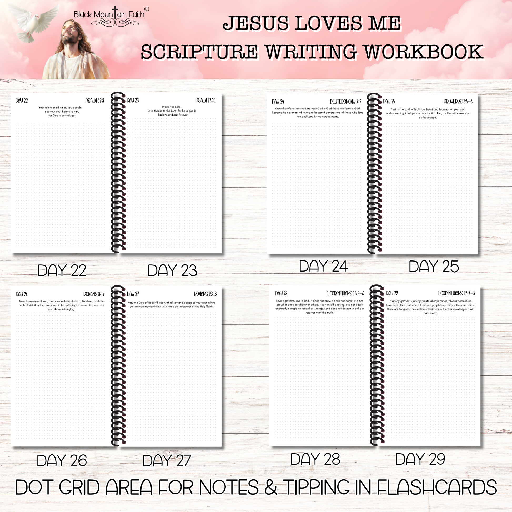 This listing is for a Scripture Writing Workbook ONLY. It includes 18 double sided pages for you to decorate and write notes while completing the scripture writing study. The front and back covers are protected with presentation plastic. There are 16 double sided pages printed on 147 GSM thick paper. All the pages in the workbook are shown in the listing photos. All scriptures have been printed on each page to allow more time for study and decoration. This paper is very hardy and will accept most mixed media mediums. To get the entire collection for this study please go to the Scripture Writing Collection menu.