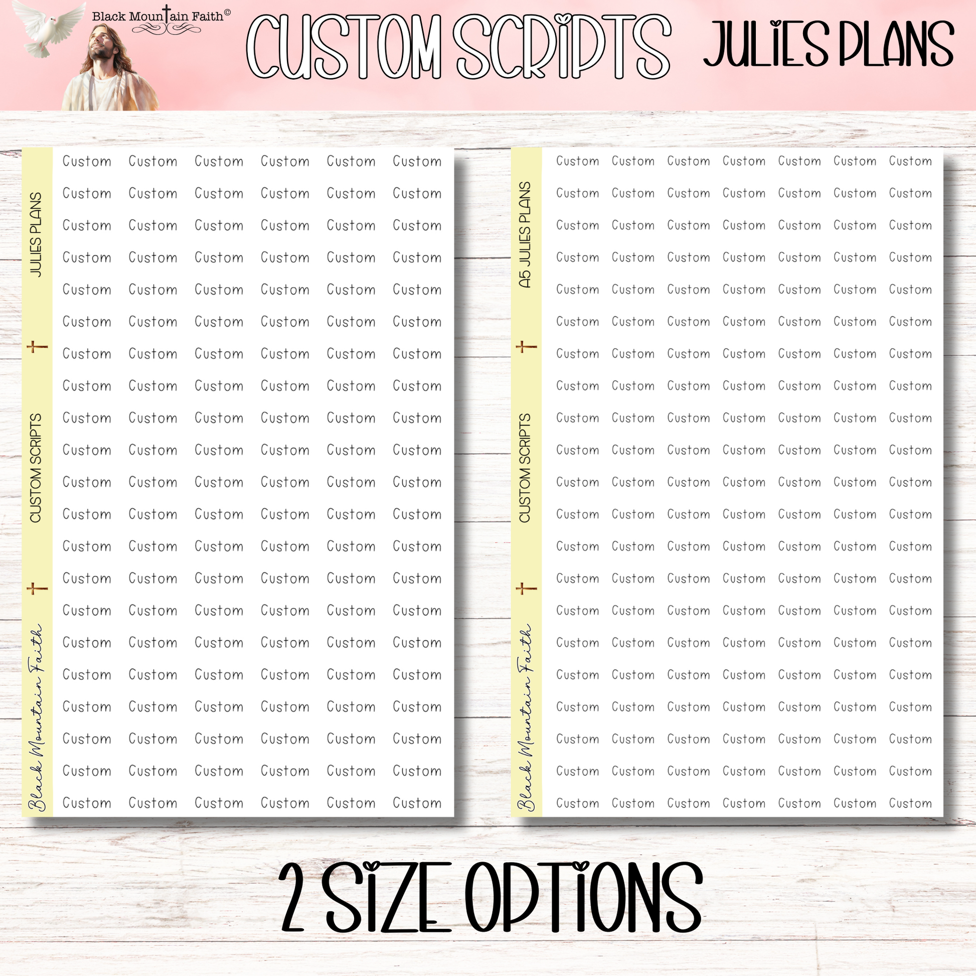 This is JULIES PLANS font option. Sheet size is 5.5 x 8.5 with 21 rows of custom scripts. Stickers per row depend on length of chosen script. Please type in personalization and size/paper choice from the dropdown menus below.