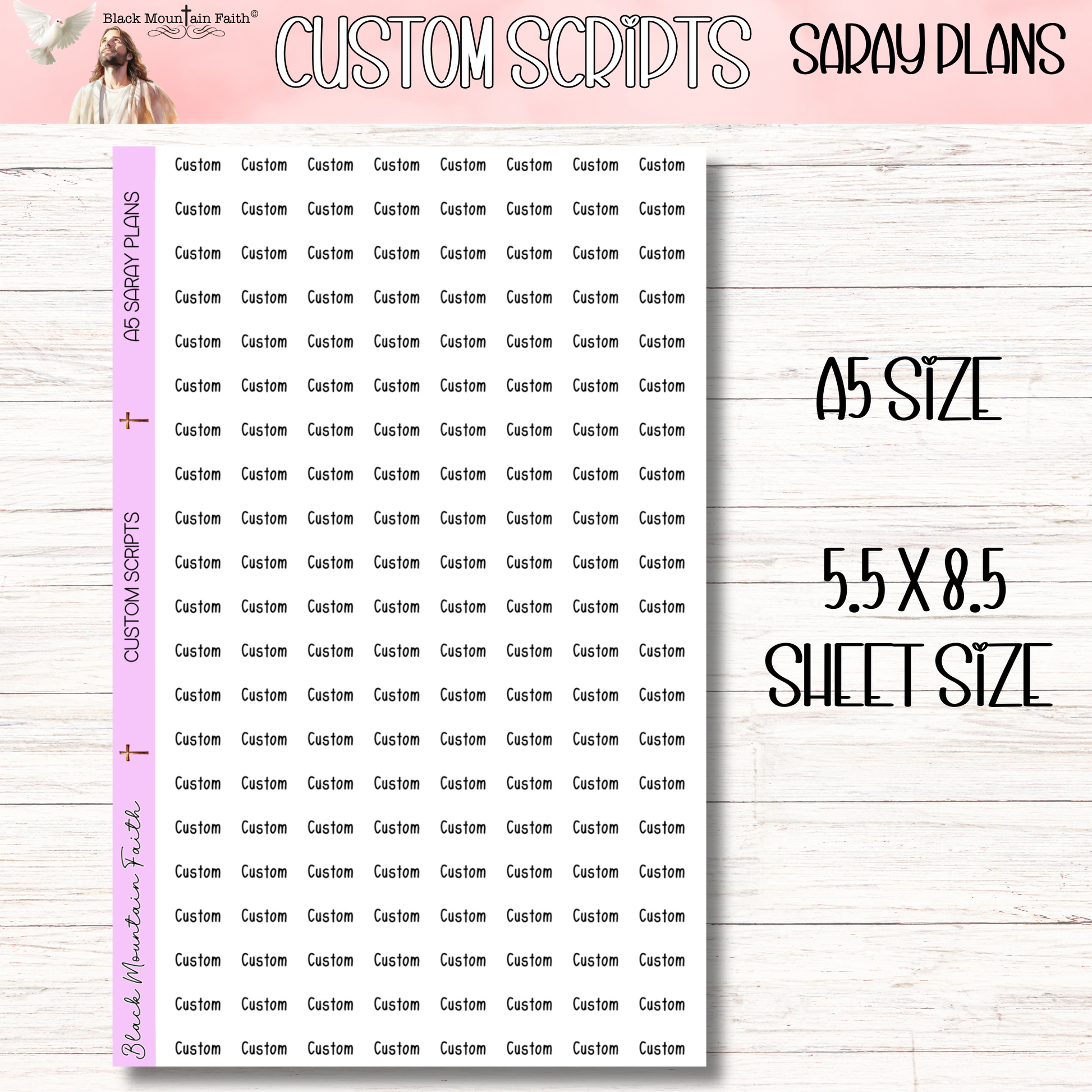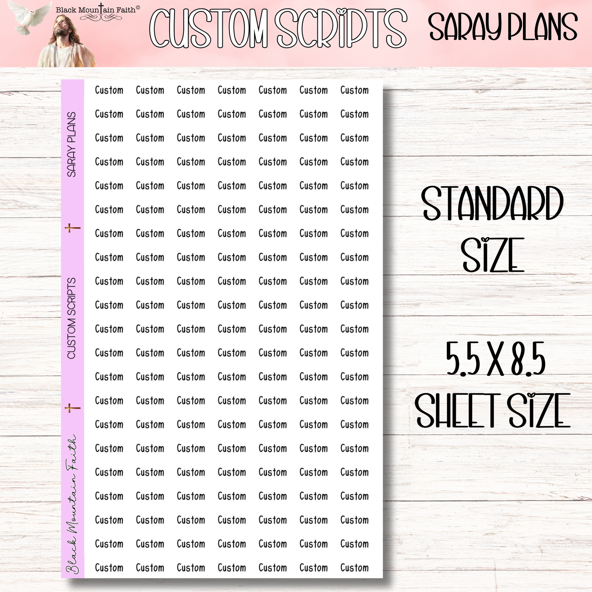 This is SARAY PLANS font option. Sheet size is 5.5 x 8.5 with 21 rows of custom scripts. Stickers per row depend on length of chosen script. Please type in personalization and size/paper choice from the dropdown menus below.