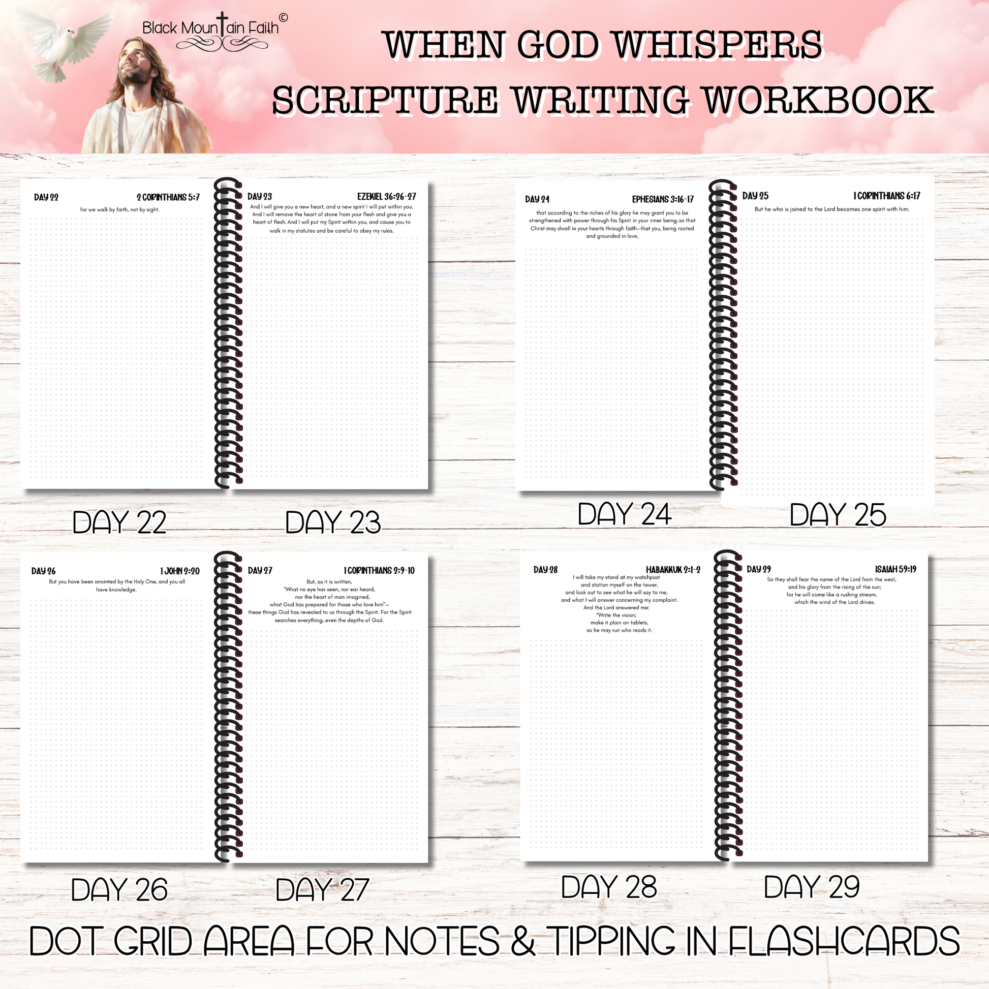This listing is for a Scripture Writing Workbook ONLY. It includes 18 double sided pages for you to decorate and write notes while completing the scripture writing study. The front and back covers are protected with presentation plastic. There are 16 double sided pages printed on 147 GSM thick paper. All the pages in the workbook are shown in the listing photos. All scriptures have been printed on each page to allow more time for study and decoration. This paper is very hardy and will accept most mixed media mediums. To get the entire collection for this study please go to the Scripture Writing Collection menu.